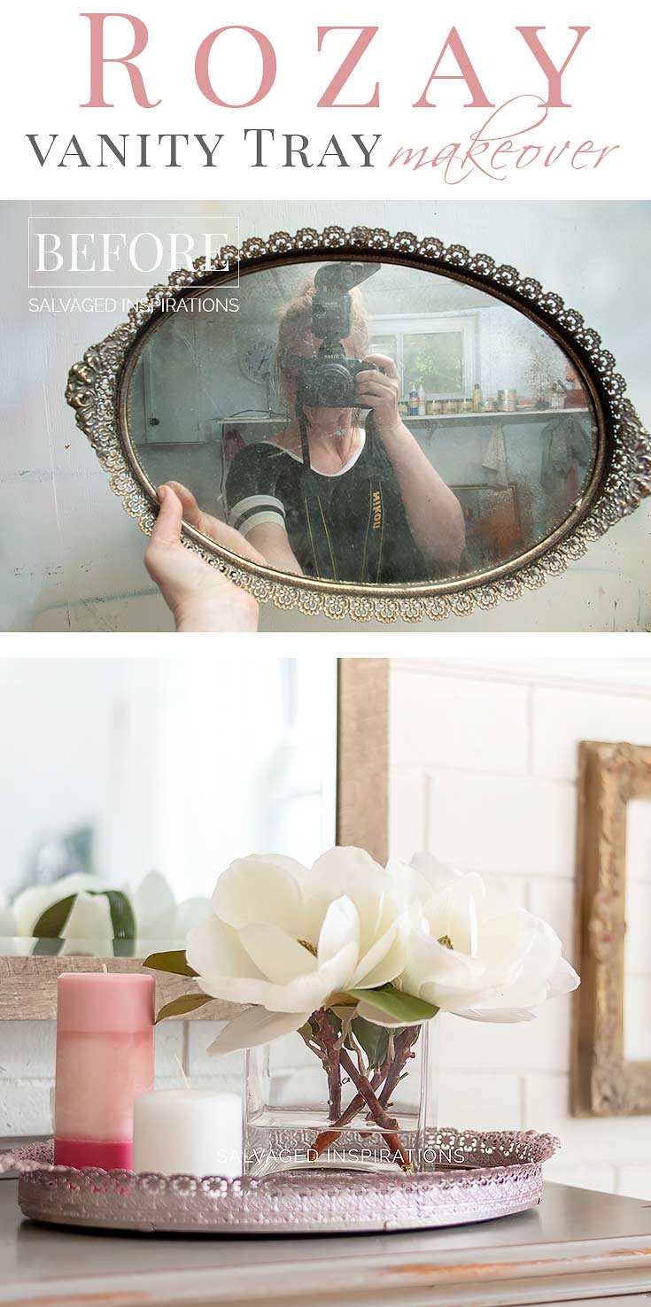 I can’t wait to try these metallic paints on some furniture but as a tester project, I started by restyling this $2.99 Vanity Tray that I picked up from a flea market years ago.