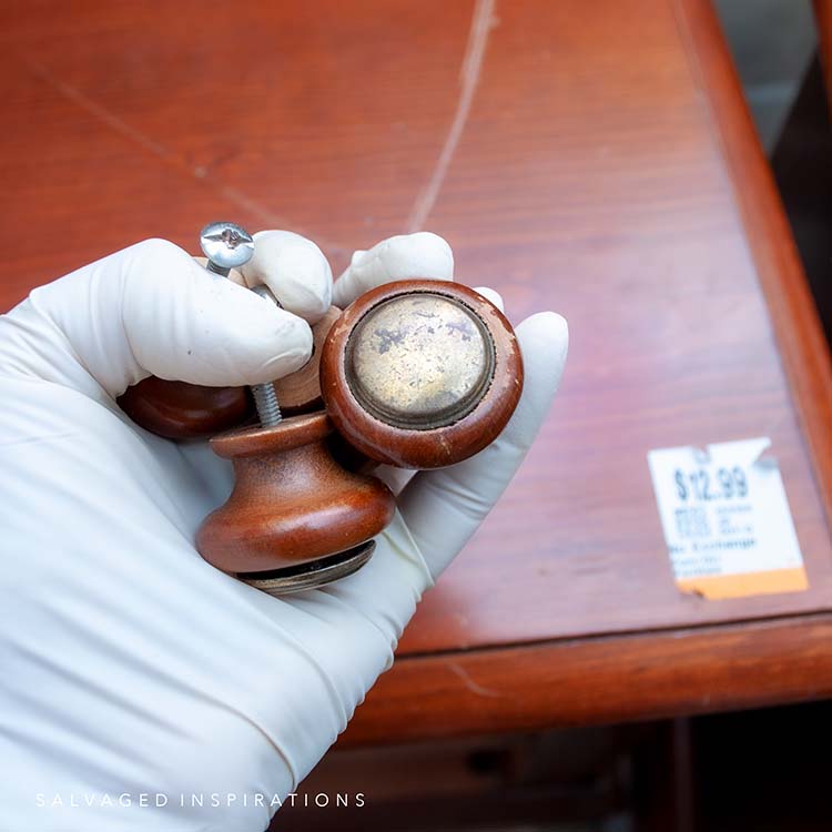 I bought these gorgeous brass knobs from Amazon and installed them in the same holes I previously filled. Yup. This happens a lot…lol. When I fill the holes I often end up re-using them — but when I don’t fill the holes – I wish I had! Now I’m in the habit of filling hardware holes 100% of the time so I’m not limited to the hardware I can use.