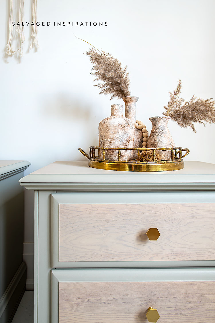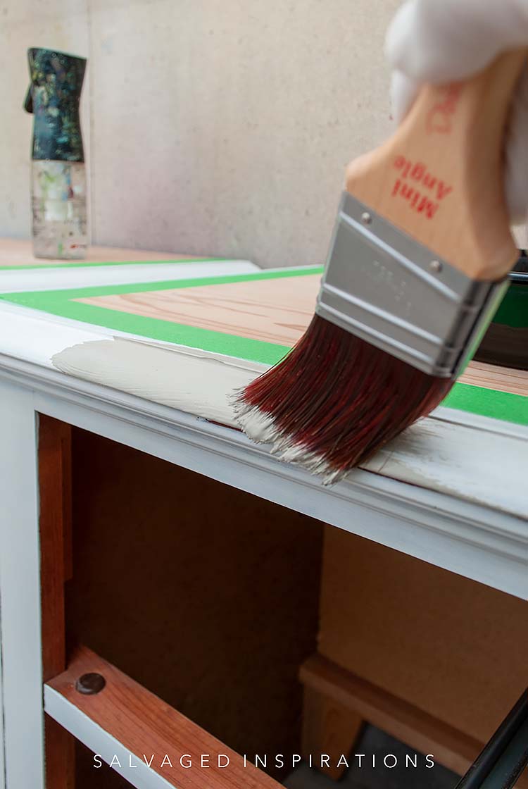I used painter’s tape to tape off the raw wood areas and primed with two coats of this BIN Shellac Based Primer to prevent bleedthrough. I have a full tutorial on how to use BIN Primer here. Once the primer was dry, I brushed on two coats of this gorgeous gray/green custom ‘boho color’ I created using this Dried Sage and Sawmill Gravy in a 50/50 mix.