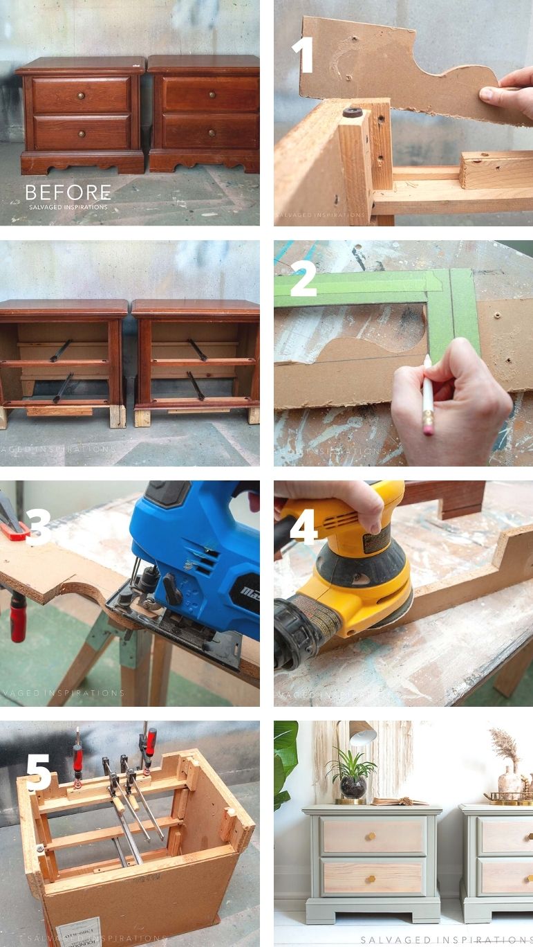 To update these nightstands I painted them in a custom color and trimmed off the scalloped bottom to change the profile of these pieces. There are a number of ways you can cut furniture trim, but I opted to try using a jigsaw.
