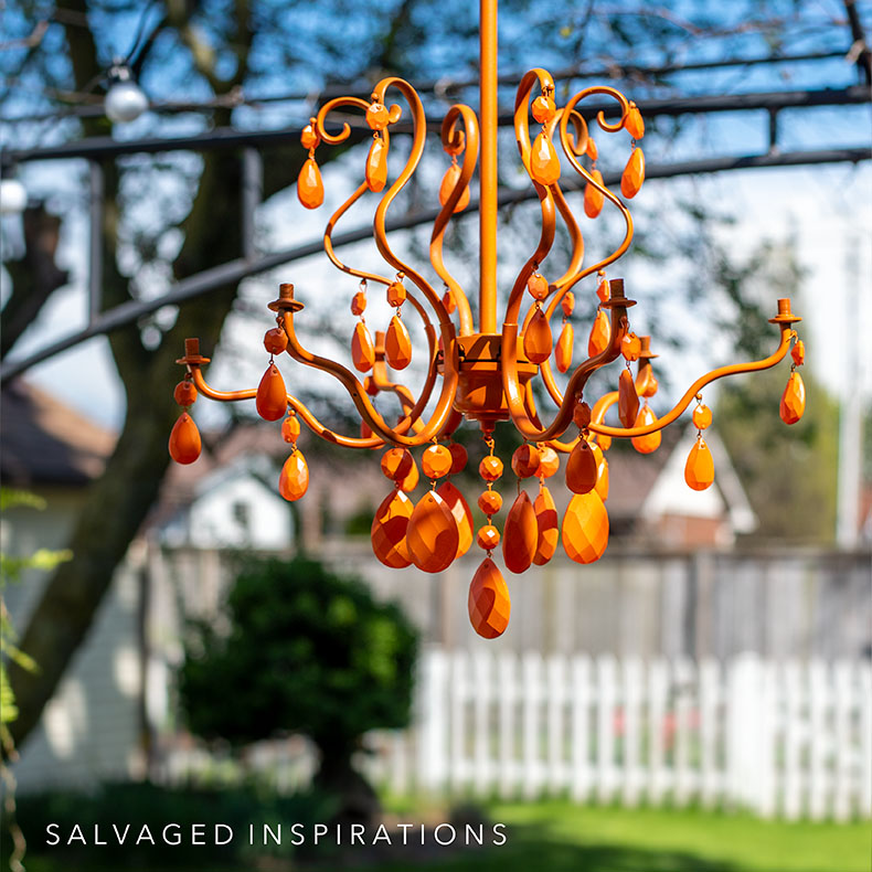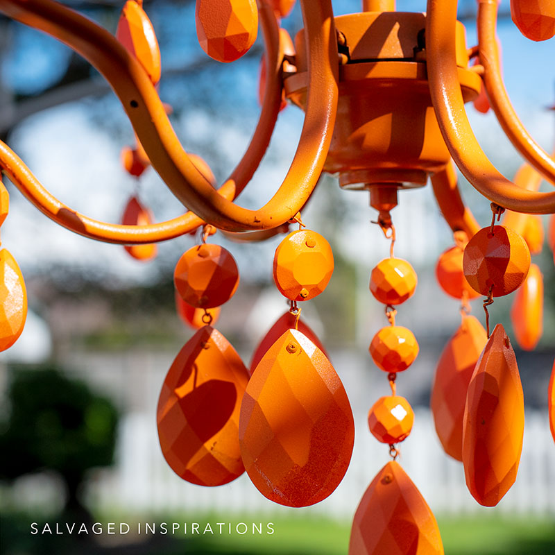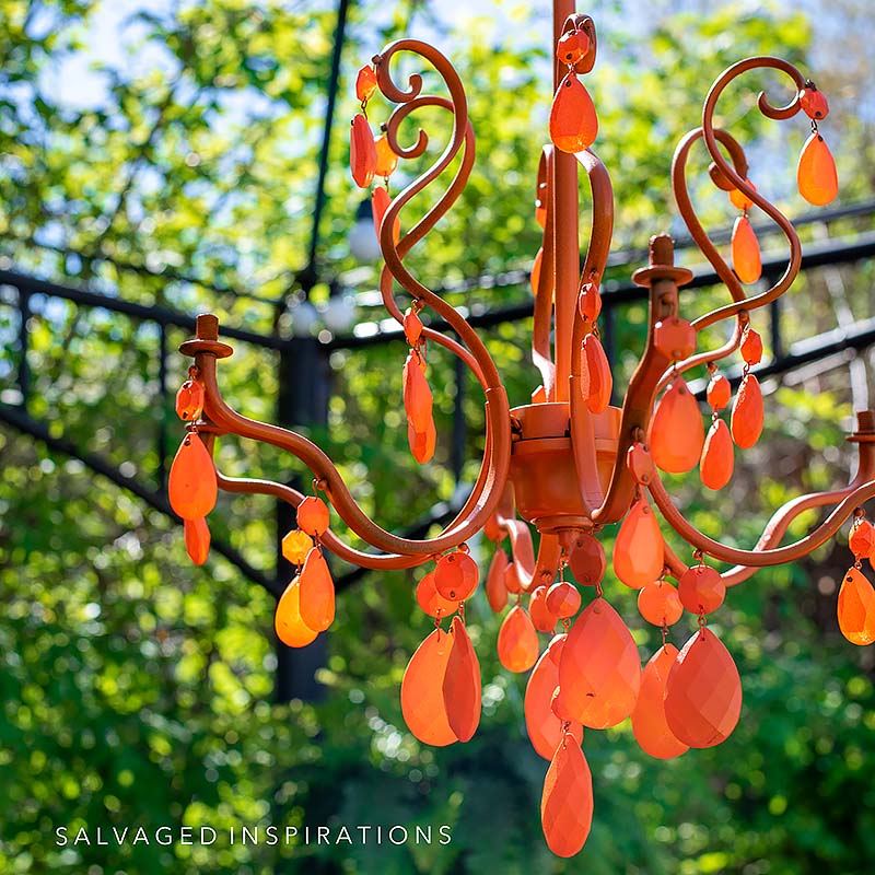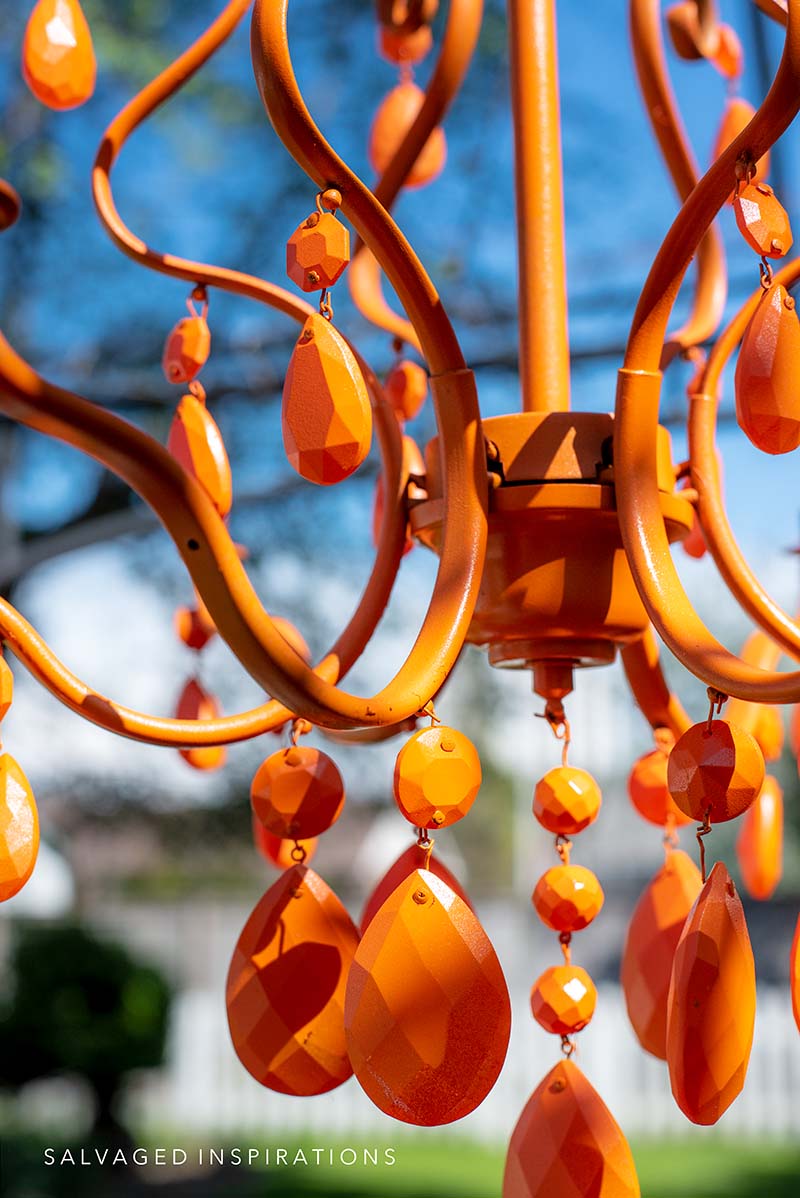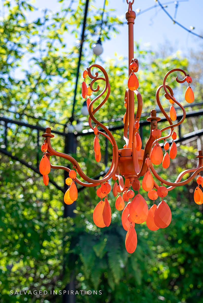 Once the chandelier was dry, Andrea and I sprayed it with a Rust-Oleum Spray Paint in Orange. I used the Univeral one but I’ve used many versions of Rust-Oleum spray paints and they all work well on plastics, metals, and outdoor furniture so I’m sure it will hold up in the elements.