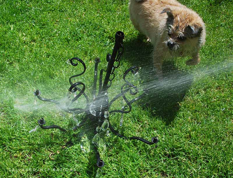 This chandelier has been stored in my garage for the last 5 years so it was filthy. For the paint to adhere it needed a really good cleaning. I brought it outside and gave it a good cleaning with the hose. Gidget had fun too!