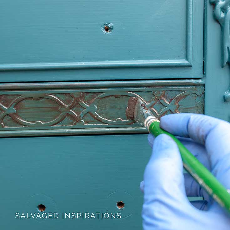 Whenever I work on a piece of furniture like this, I do my best to highlight the details. There are a ton of products and techniques to do this, gilding wax, chalk paste, colored wax, and dry brushing to name a few, but today I’m using good ol’ furniture glaze. It comes in a variety of colors, it’s easy to use, and the best part is you have TOTAL control with how bold or subtle the effect.