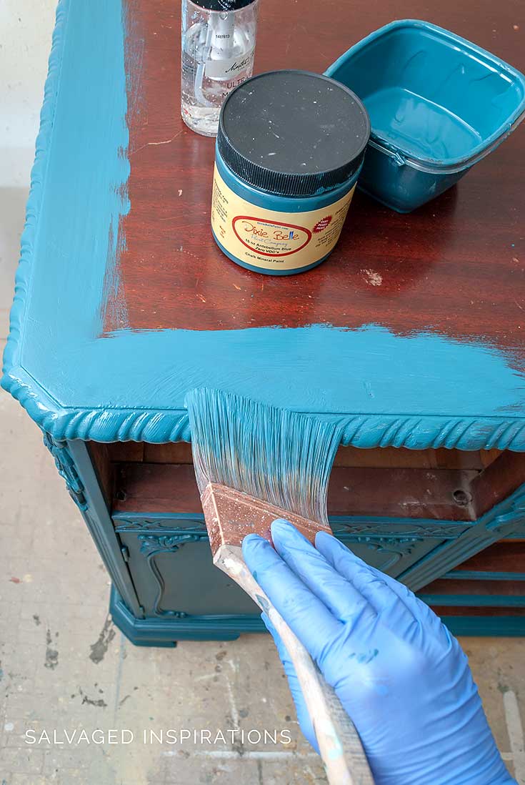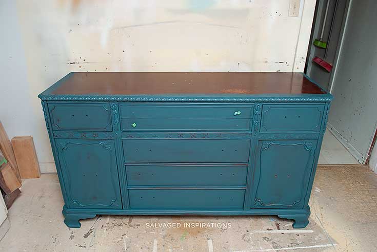 After this buffet was repaired and cleaned, I gave it two (2) coats of this NEW Antebellum Blue – one of the new colors in the DB line. What a gorgeous rich color! I would describe it as a mix of a peacock and teal. Here’s what it looked like after the first coat.