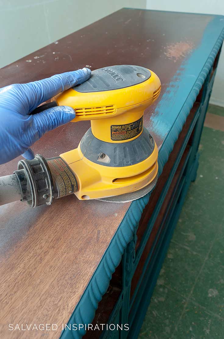 This way I don’t have to mask off anything with green tape and it gives me a PERFECT crisp edge. Once I use my orbital sander to remove the existing finish along with the overlapped paint, I end up with a crisp clean painted border and a stained top.