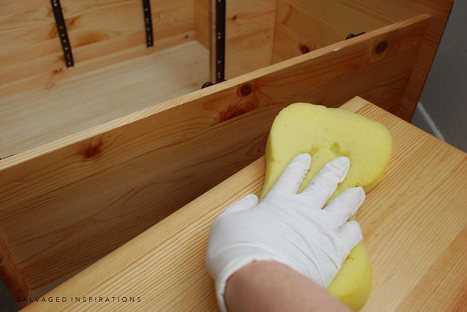 Once the two coats of stain were dry, I mixed up a paint wash with a 50/50 mix of Coffee Bean Chalk Mineral Paint and water. I applied the first wash by brushing it on and then wiping off the excess with the grain. This gave the piece a nice rich color. Once dry, working in sections I applied another coat of the wash and dabbed it off with the shop cloth to give this piece an old-school look as seen below. I have a full tutorial on How To Create A Wash Finish here.
