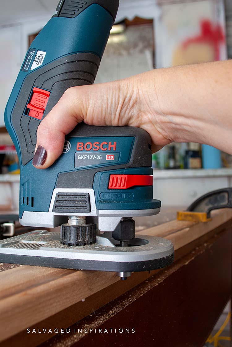 To soften the edges on this scrap piece of wood, I routered the edges using my NEW Bosch Cordless Palm Router. Omgosh, I LOVE this tool. It’s small enough to fit comfortably in my hands and light enough to maneuver easily. I also like that it has a large resting ‘shelf’ that sits on the wood so I don’t have to balance it like other routers I’ve used. This little tool is a game-changer for me!