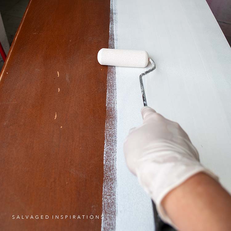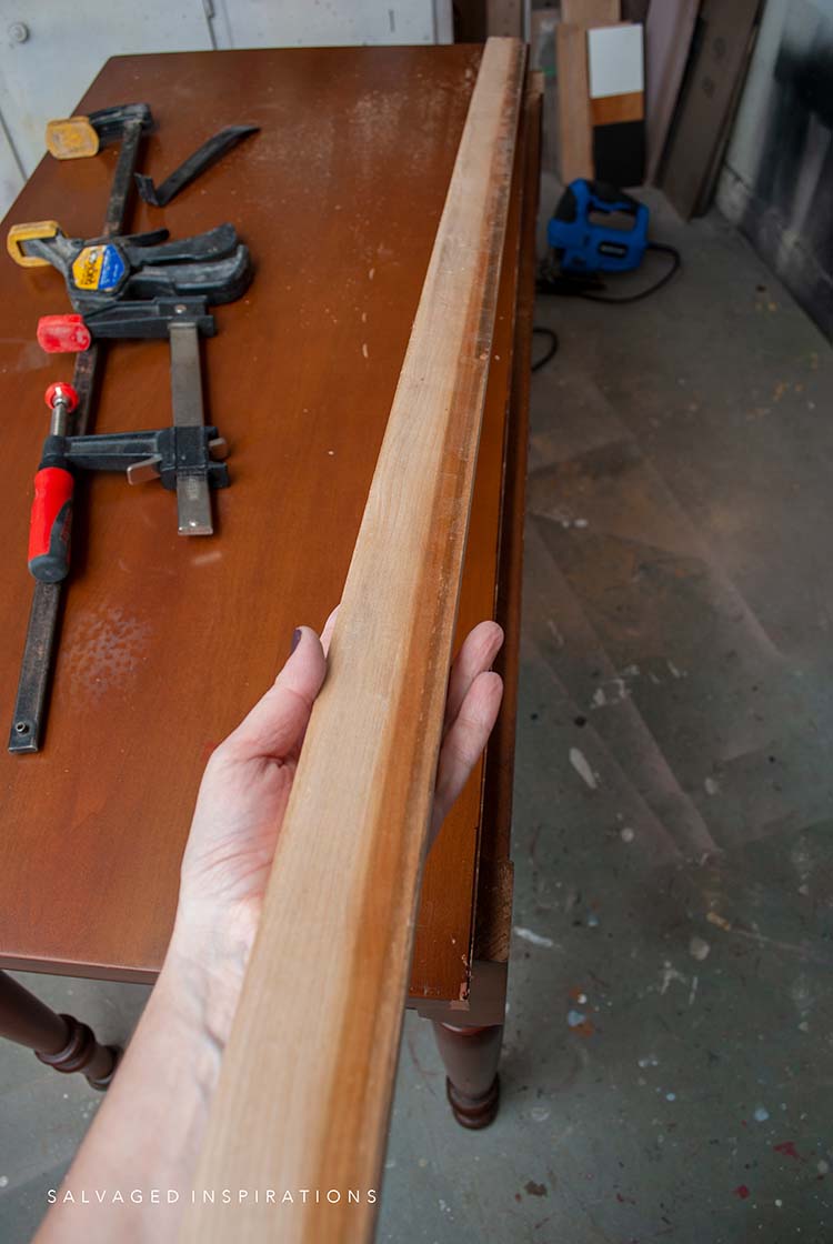 Personally, I love backboards on vintage furniture. But not so much when it’s a dated piece that I’m trying to look more sleek and modern. So along with changing the color, I removed the backboard and filled it in with my own.