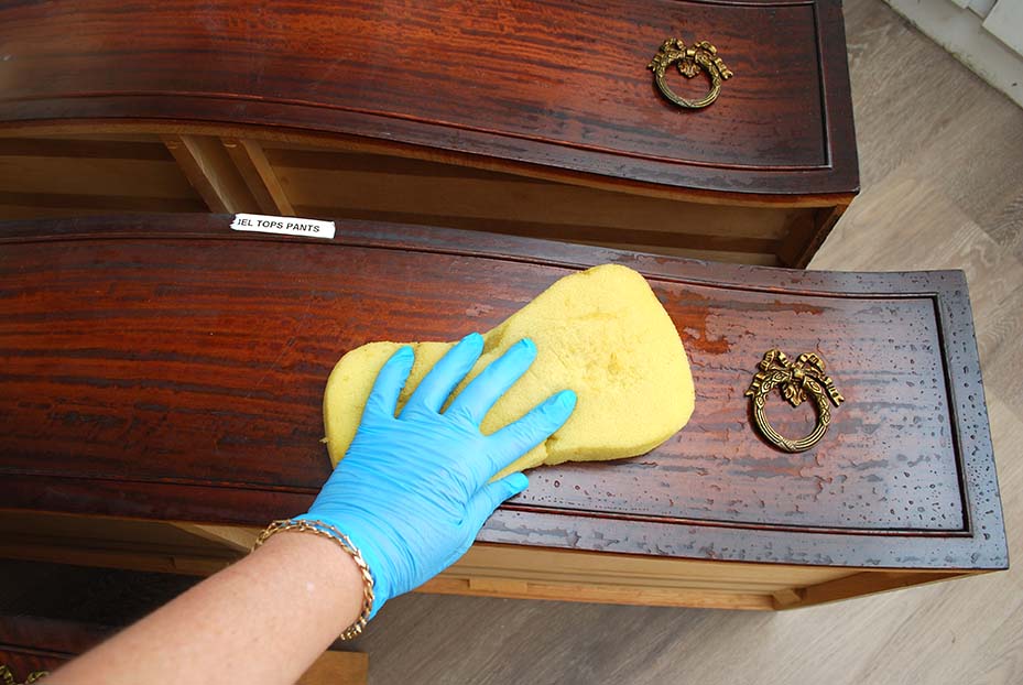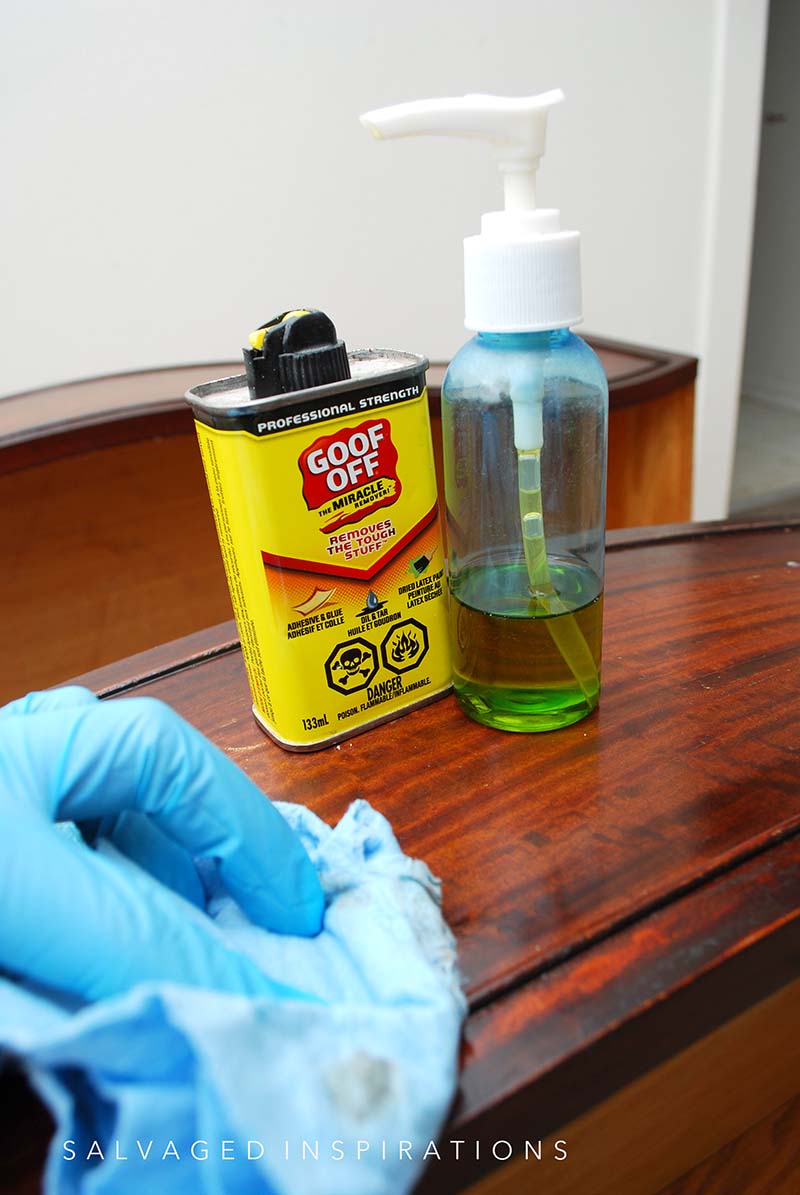 As you can see in the ‘before’ pic and the image above, this dresser had sticker labels on the drawer. TSP or cleaner won’t remove stickers or sticker residue. But you have something in your kitchen that will. OIL! I keep a bottle of this Goof OFF when I want/need to go the chemical route but I also keep a pump bottle of olive oil in my workspace. Any cooking oil or baby oil will remove sticky residue from your furniture! Just add a few pumps of oil onto the sticky residue and wipe with a cloth. It comes off like magic!