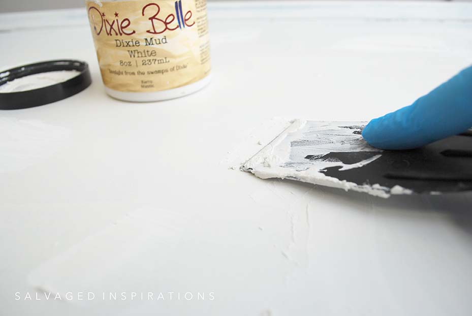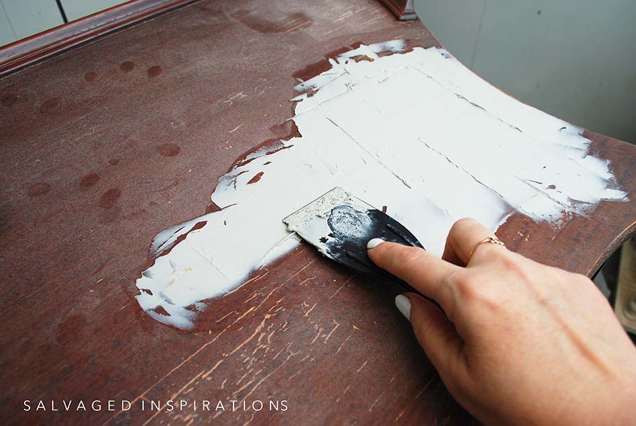 After I had all the loose and bubbled veneer off, I filled and repaired the damaged areas with Bondo. I used this All Purpose Bondo as I don’t notice ANY difference in the Wood Fill Bondo VS the All Purpose — other than the price difference. I have a full tutorial on How To Repair Furniture with Bondo here.