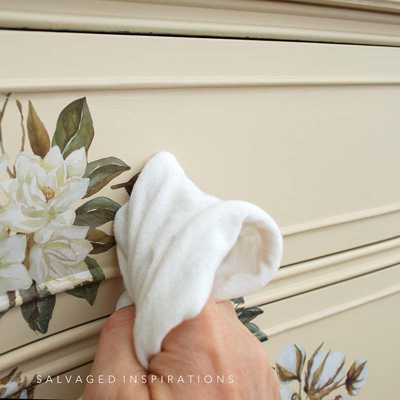 TIP ~ To remove the ‘halo’ around your furniture transfer, burnishing it with a cloth or your finger works really well. To burnish the design, all you have to do is run your finger or soft cloth along all the edges and the halo will disappear. You can see it in action in the Youtube Video tutorial below! 🙂