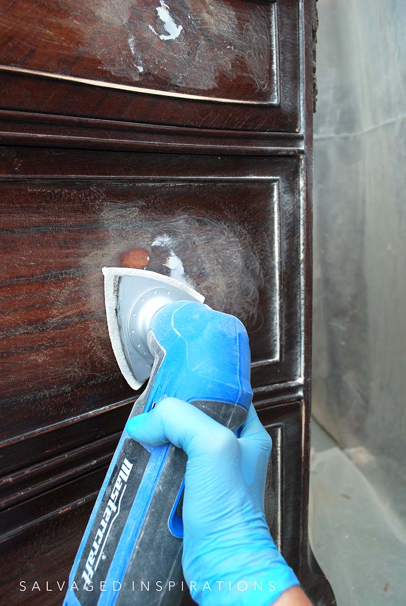 Then using my orbital sander and an 80 grit, I scuff-sanded the entire dresser and smoothed out the Bondo. To sand the smaller corners and areas of the dresser I used my Oscillating Tool. These tools come with a variety of blades to cut metal, plastic wood, AND a sandpaper attachment for tight areas. I have a Mastercraft brand from Canadian Tire but I WISH I had this Bosch one!