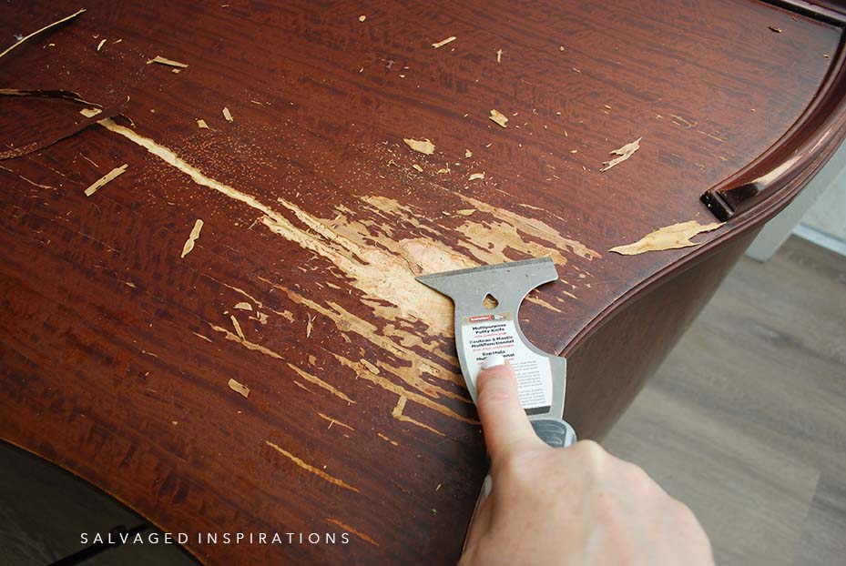To fix the veneer, I used this painter’s utility tool. These putty knives are made for painters as they scrape paint off rollers, remove nails, gouge, cut sandpaper, open cans, remove veneer, and more. They are super cheap too. I get mine from the dollar store!