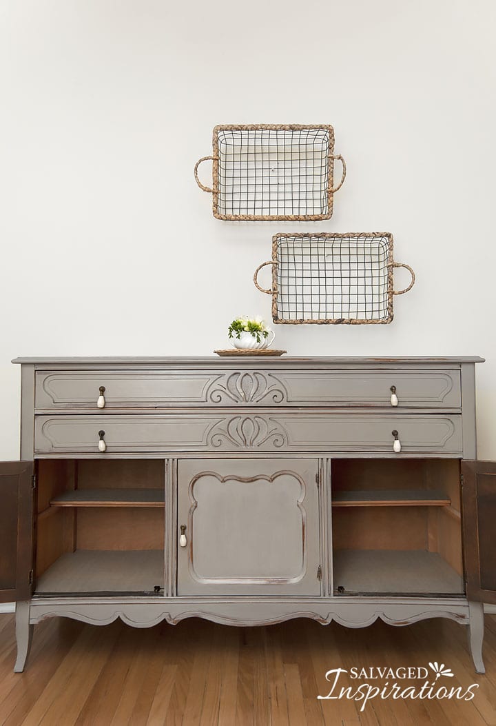 To give this buffet/sideboard an elegant ‘french country’ look, I wet-distressed the top, around the edges, drawers and doors. LOVE it! This is one of those pieces I’ll be sad (yet-happy) to sell.