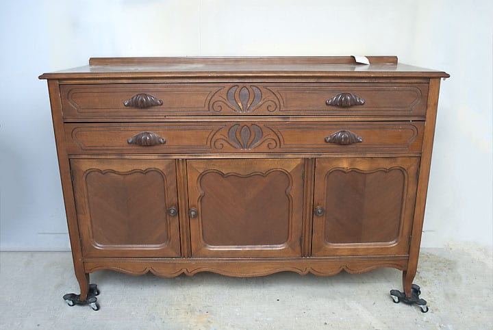 Last week I bought this buffet/sideboard from a local Thrift Shop. It looked amazing from the front, but the back was coming off and there was missing veneer on the sides. After all the repairs were finished, I chose to paint this piece in Annie Sloan’s French Linen. AS French Linen is such a beautiful greige for any of you looking for a stunning neutral!