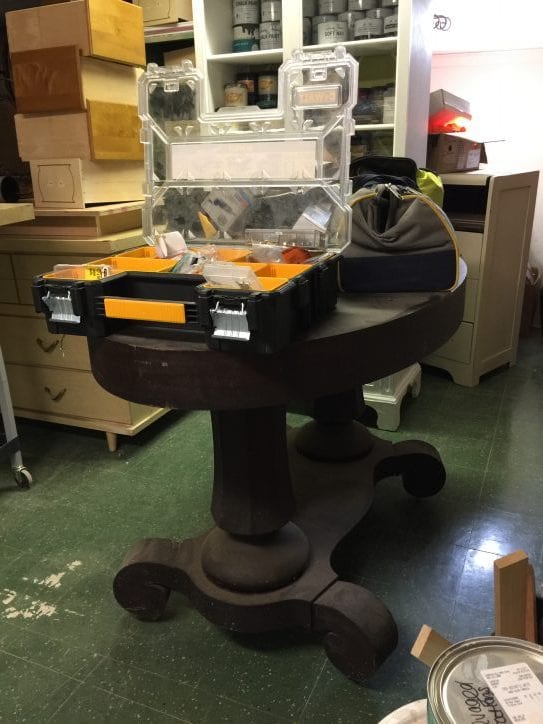 When MMM brought it in for its makeover, I lost interest for whatever reason, and it became a handy spot to put my tools and supplies on. The added bonus was the wheels which made it easy to move around. A fancy work table, eh?!