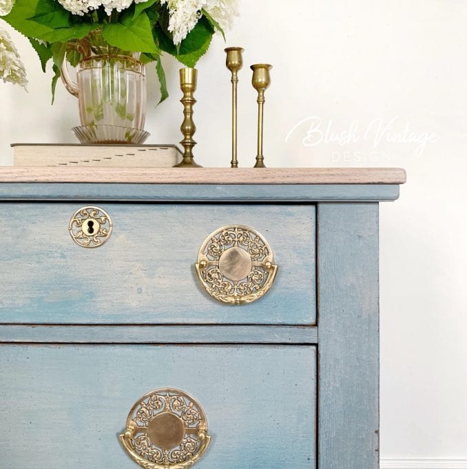 Color combos aren’t just for Chalk and Mineral paints. Check out what Jeanne from Blush Vintage Design did with milk paint! Painted with Miss Mustard Seed’s Milk Paint in Flow Blue, a custom blend (Flow Blue, Grain Sack, Eulalie’s Sky and Artissimo), and finished with a watered-down wash of Schloss, this piece is heavenly.