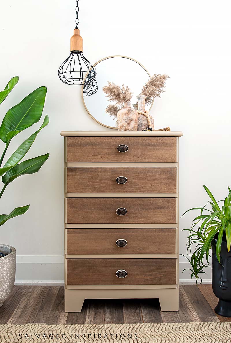 As I mentioned above, a clean modern look often takes more work than an ‘artistic’ finish because every little detail shows up and there is no covering it. Using a soft paintbrush to minimize brush marks, I painted in Coffee Bean and the bottom in this Sand Castle Mineral Paint. I think the contrast in colors gives a clean look.