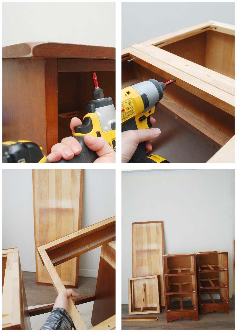 To give these nightstands an updated base, I wanted to get rid of the whale-tail-skirt and used my jigsaw to create a straighter profile. My first attempt went a little crazy (which I’ll share in this Saturday’s Youtube tutorial) so I had to adjust my measurements higher than I planned, but it all turned out okay. I used a square and a sharpie to draw out the base. I followed the new profile with my jigsaw. Then sanded the edges smooth.