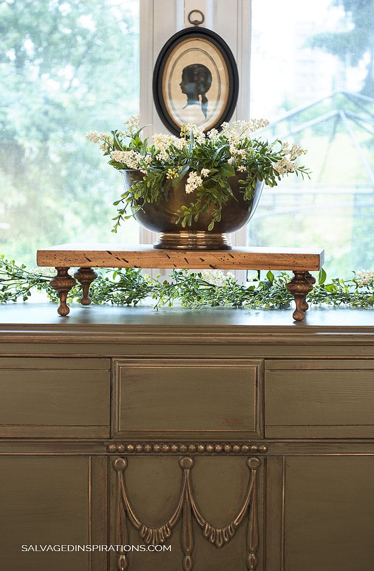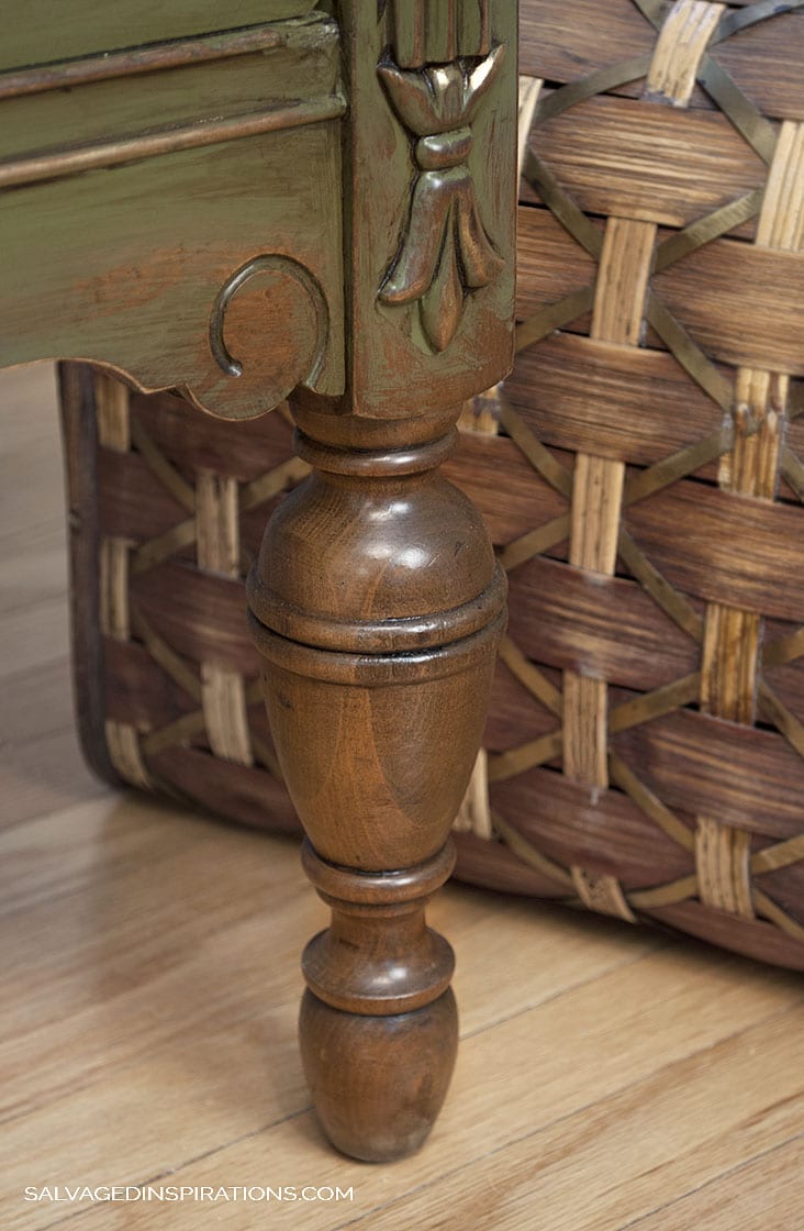 To achieve old-world-antique-charm, I first cleaned the piece and made repairs. Once the drawer was fixed and the scratches were filled, I gave it an overall sanding and painted with 2 coats of Annie Sloan’s Olive. After sanding and distressing the final coat, the Olive was dark glazed with GF Vandyke Brown Glaze Effects. Three coats of Varathane Satin Polyurethane was applied for protection – sanding between each coat.