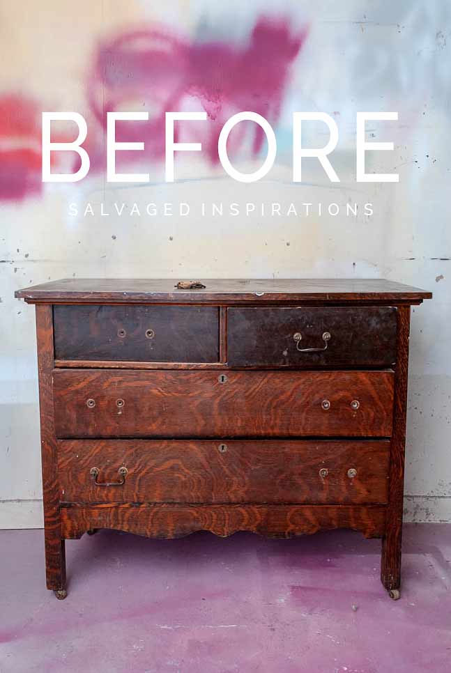 Here’s what I started with. This vintage tigerwood/fumed oak dresser. I shared a before video on my Facebook page which you can see here.