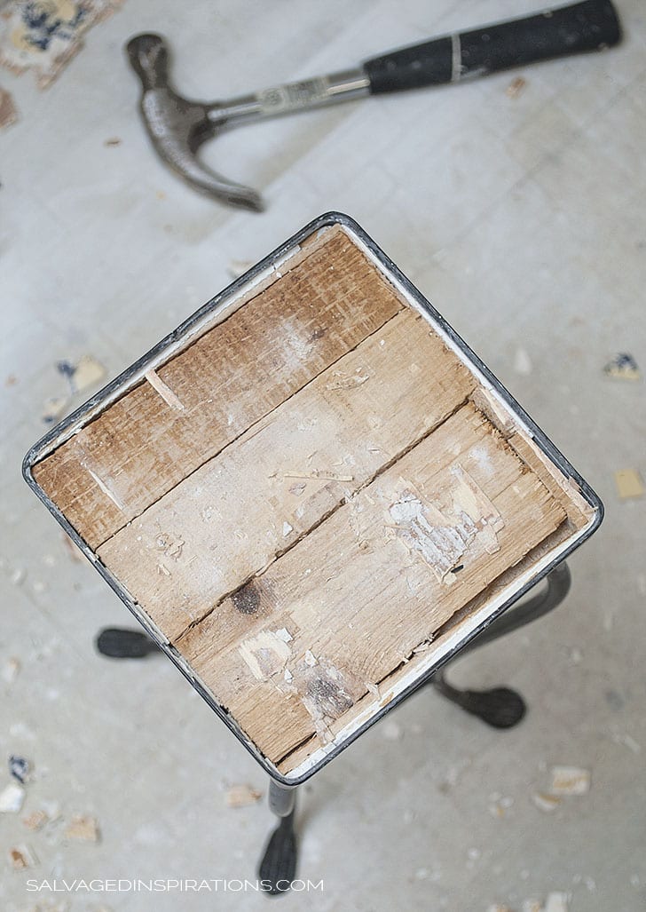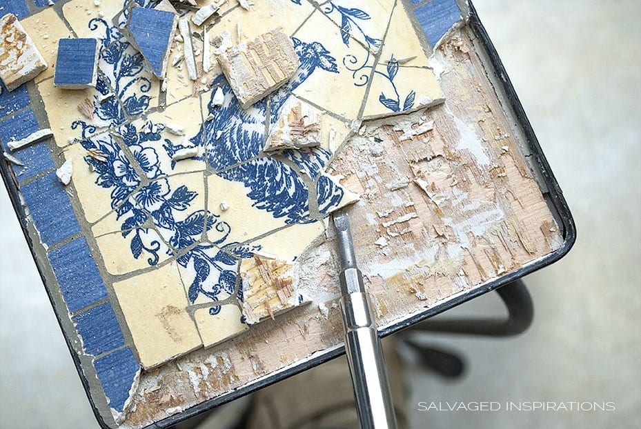 I started by smashing out the rooster tile and removing the boards it was glued on to.