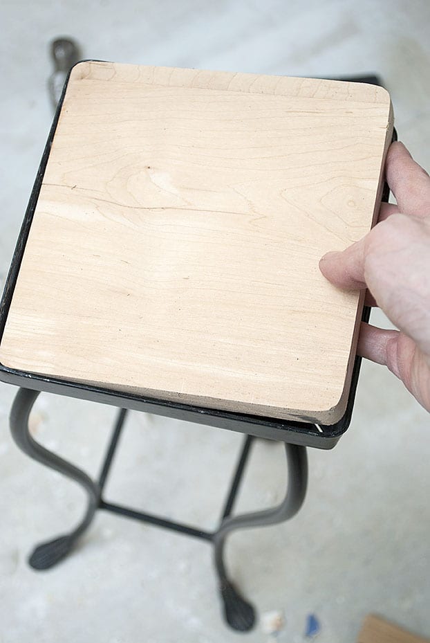 I had this salvaged plant stand hanging around in my craft room for years. The rooster mosaic was cute, but not my style and it was rough around the edges – literally. Ouch!