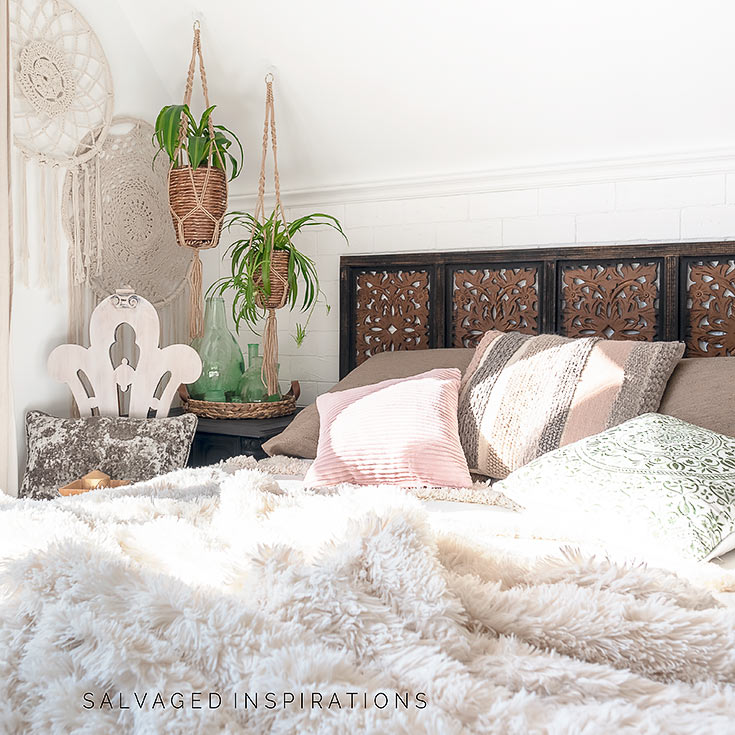 Lately, I’ve been incorporating a little more boho into my decor. This includes plants, macrame wall art, throw pillows (ordered from Amazon but haven’t arrived yet), and a lot of textured throws. I’m really happy I found this new-to-me headboard. And NO painting needed. I’m going to keep this carved wood look. If I get bored of it and decide I want to change it up, I can always paint it another color down the line.
