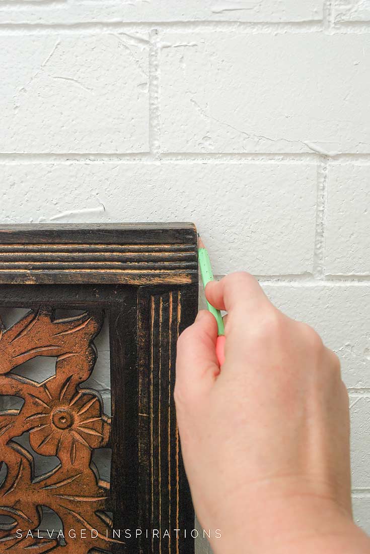 I measured and centered the wall hanging above the bed. Then marked out the corners with a pencil.