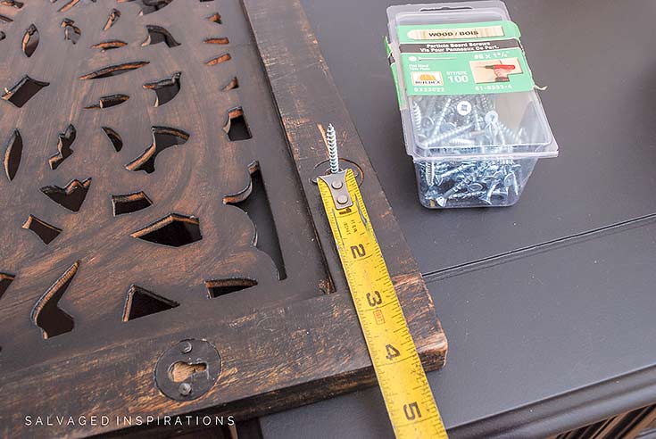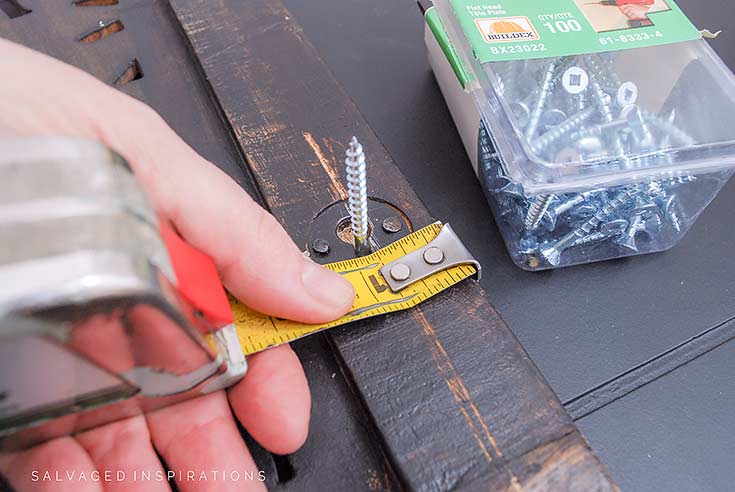 To make sure I hung it exactly where I wanted it, I subtracted 4 inches from the top pencil mark and 3/4 of an inch from the side pencil mark to match up with the hanger on the back of the headboard.