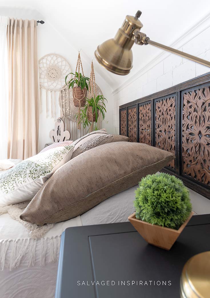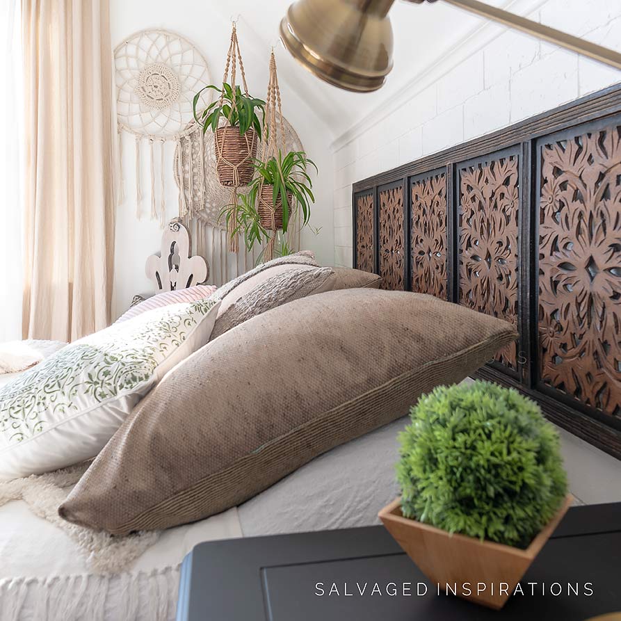I’m loving this new headboard! It adds a boho vibe without being over the top. It ties the wood in the bedroom all together while giving it some natural warmth and interesting detail.
