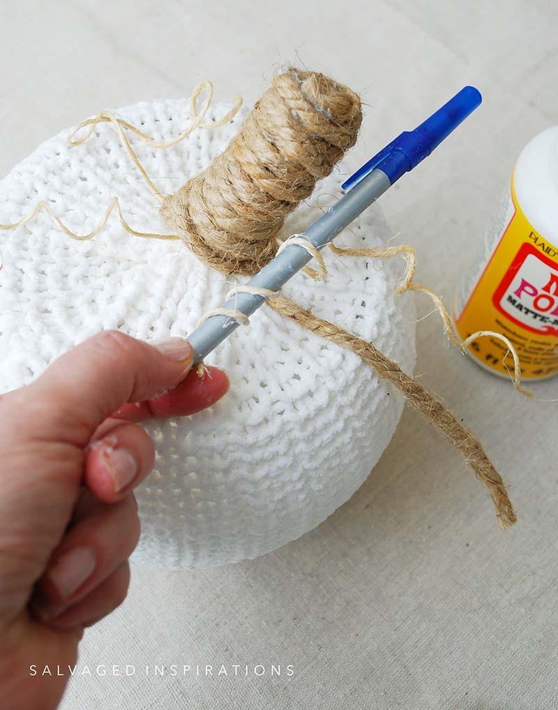 Remember the natural jute twine string I tied around the sweater? Here’s where they come into play. If you don’t have any twine string, you could use yarn. If you don’t have any yarn, unravel a piece from the sweater you just cut to make these pumpkins! To make some curly cues for these pumpkins, I took some Mod Podge and rubbed some on the twine string with my fingers. I rubbed it on the full length being sure to get some on both sides.