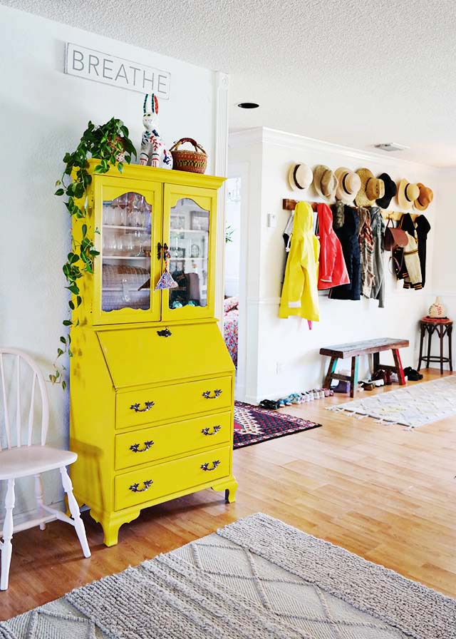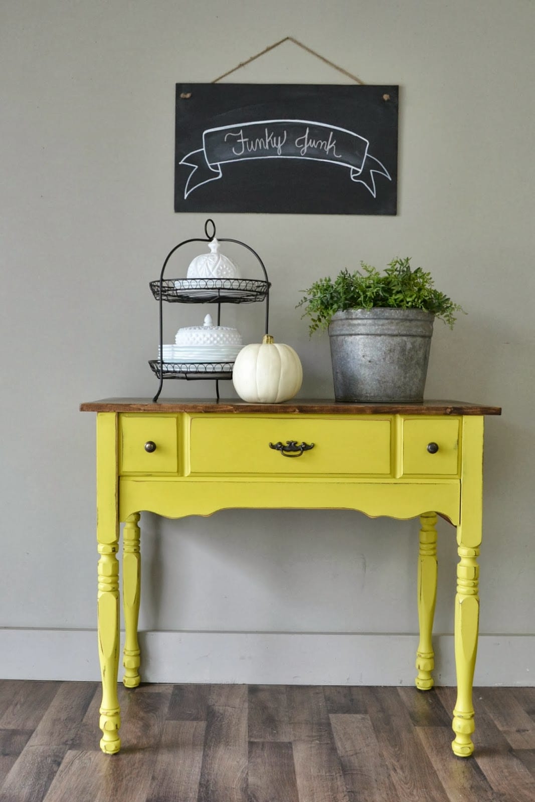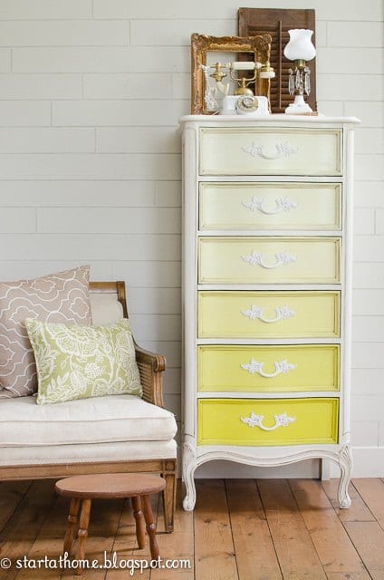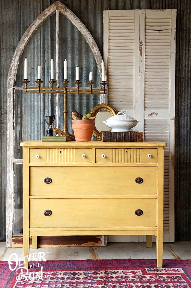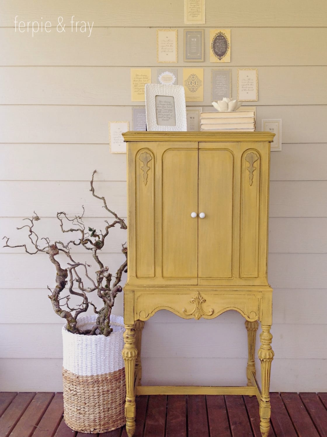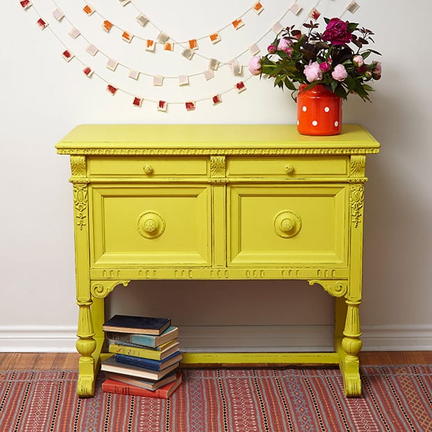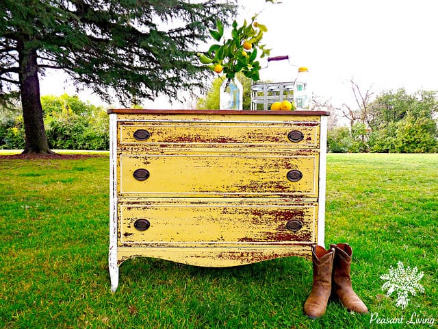 We had fun with our last Think Pink and Think Green roundup, so today I’m sharing 25 Beautiful Furniture Makeovers in various shades of sunshine. I picked this uplifting color in hopes it would inspire and perk me up. I think it’s working. As I sit here curating this roundup, I’m getting the urge to head down to my studio and paint.