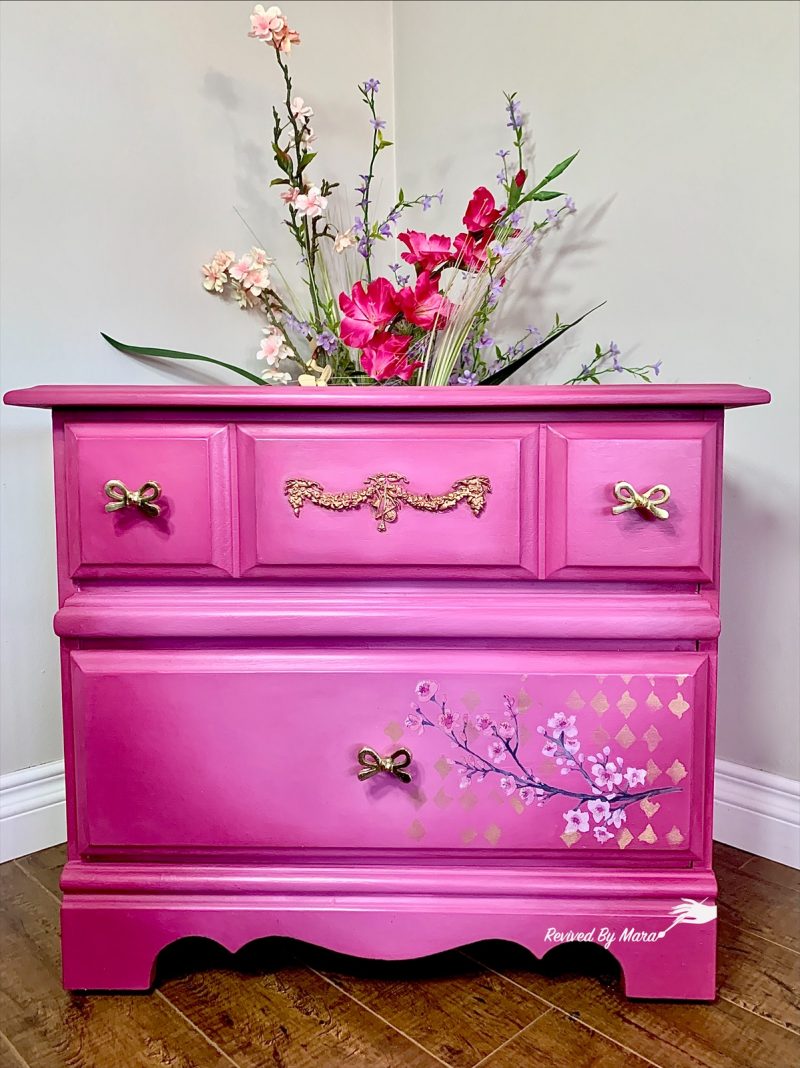 My friend Mara from Revived By Mara created this sweet side table for Breast Cancer Awareness Month last October. The blending, cherry blossoms and gold detailing scream romance to me!