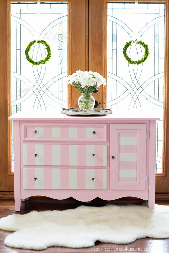 Take a look at this sweetheart! This soft pink and white striped dresser was created by Christy from Confessions of A Serial DIY’er.