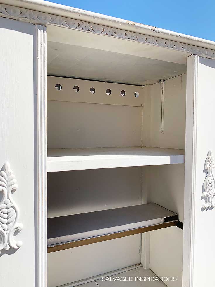 This old stereo cabinet required repair before painting. There were holes in the back, lifting veneer on the bottom and peeling paint all over.