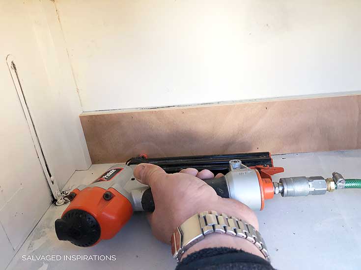 Nick cut a 1/4″ oak plywood to cover the back holes. When primed and painted, it blends in beautifully and you can’t even tell it’s there!